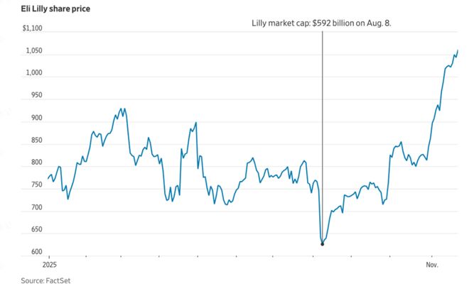 公司市值与股价表现 - 礼来公司股价于11月21日上涨1.59%,收报1059.70美元/股,市值突破1万亿美元,成为全球首家市值破万亿美元的医药公司 [1] - 礼来是继伯克希尔·哈撒韦之后第二家市值突破万亿美元的非科技类公司 [1] - 今年以来,礼来公司股价上涨近四成 [3] 核心产品业绩 - 旗下减重药物替尔泊肽(Tirzepatide)热销是股价上涨主因,该药物分为治疗糖尿病的Mounjaro和针对肥胖症的Zepbound [1] - 2023年,Mounjaro销售额同比暴增970%,Zepbound上市首月销售额达1.76亿美元 [1] - 最新财报显示,Mounjaro三季度收入65.2亿美元,同比大增109%;Zepbound三季度收入35.9亿美元,同比大增184% [1] - 三季度两款药物合计收入突破100亿美元,超越默沙东的K药成为新晋“药王” [1] 市场地位与竞争格局 - 礼来产品在美国新增患者中的市场占有率达到70%至75% [2] - 与竞争对手诺和诺德相比,资本市场更看好礼来,今年以来礼来股价上涨近四成,而诺和诺德股价下跌逾40% [3] 产品管线与未来展望 - 口服小分子GLP-1类药物orforglipron即将上市 [2] - 分析师预测,礼来公司的三款GLP-1药物的全球峰值销售额将达到1010亿美元 [3] 行业政策与市场影响 - 礼来受益于与特朗普政府签署的协议,将与美国市场大幅降低减重药物价格,以换取相关药物被纳入联邦医疗保险覆盖范围 [3] - 该价格协议可能短期内压低收入,但将显著提升药物可及性,使多达4000万美国人可能成为肥胖治疗的潜在用药对象 [3]