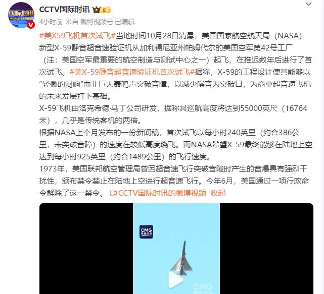 X-59飞机由洛克希德·马丁公司研发,据称其巡航高度将达到55000英尺(16764米),几乎是传统客机 的两倍。 根据NASA上个月发布的一份新闻稿,首次试飞以每小时240英里(约合386公里,未突破音障)的速度 在较低高度绕飞。而NASA希望X-59最终能够在陆地上空达到每小时925英里(约合1489公里)的飞行 速度。 1973年,美国联邦航空管理局曾因超音速飞行突破音障时产生的音爆具有强烈干扰性,颁布禁令禁止在 陆地上空进行超音速飞行。今年6月,美国通过一项行政命令解除了这一禁令。 CCTV国际时讯 Y => 4小时前 来自 微博视频号 已编辑 来源:@CCTV国际时讯 0:00 当地时间10月28日清晨,美国国家航空航天局(NASA)新型X-59静音超音速验证机从加利福尼亚州帕 姆代尔的美国空军第42号工厂(注:美国空军最重要的航空制造与测试中心之一)起飞,在推迟数年后 进行了首次试飞。据称,X-59的工程设计使其能够以"轻微的闷响"而非巨大轰鸣声突破音障,以减少噪 音为突破口,为商业超音速飞机的未来发展打下基础。 #美X59飞机首次试飞#当地时间10月28日清晨,美国国家航空航天局(NASA) 新 ...