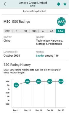 近日,全球最大指数公司明晟MSCI发布了2025年度企业ESG评级结果。联想集团凭借在ESG领域的系 统实践与长期投入,获评全球最高等级AAA。 近年来,联想集团在可持续发展战略方面取得了重大进展,不仅在全价值链净零转型、生物多样性保 护、人工智能负责任治理以及企业社会责任等领域坚定投入,还将ESG打造成企业级服务与解决方案, 赋能更多企业提升ESG实践。凭借着ESG卓越表现,联想集团在海内外ESG评级机构中均维持领先,包 括2025恒生可持续发展指数AA+评级;CDP气候变化领导力A级、供应商参与度评级A级及水安全领域 A-级;EcoVadis可持续发展评级最高荣誉"铂金奖章";2025 Sedex供应链大奖及2025《财富》中国ESG 影响力榜等。 AI变革叠加全球价值链调整,ESG稳健表现为联想构建可持续增长护城河 当前,全球贸易环境面临关税风暴与地缘政治挑战,叠加人工智能技术浪潮的深刻变革,中国的企业, 尤其是深嵌于全球产业链价值链的科技制造业,正处于双重考验之中。然而,动荡与逆境"筛"出了更具 韧性和前瞻性的企业,将挑战转化为战略机遇:通过加大清洁技术投入、深化数字化转型提升效率、严 格管控供应链风 ...