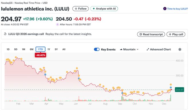 来源:智通财经 智通财经记者 | 秦李欣 智通财经编辑 | 任雪松 截至目前,今年lululemon公司股价已下跌46.40%,市值蒸发约250亿美元。市场和投资人对lululemon的 未来充满了担忧。 当地时间12月11日,lululemon官网发布公告称,已任职超七年的Calvin McDonald将辞去首席执行官一 职。此决定将于2026年1月31日生效。为确保平稳过渡,Calvin McDonald将在2026年3月31日前担任公 司高级顾问。同日,lululemon还最新发布了2025财年第三季度财报。在lululemon宣布领导层变动和季 度业绩后,其股价在盘后交易中上涨了10%。 图:截自Yahoo Finance 实际上,lululemon创始人Chip Wilson曾公开批评lululemon董事会和CEO Calvin McDonald,认为他们使 lululemon正逐渐"失去潮流感"(loss of cool)。今年10月,他自费在《华尔街日报》刊登广告,矛头直 指公司管理层:"专注于财务的首席执行官们不知道如何吸引或激励创意人才,更糟糕的事,他们自认 为了解优秀的产品,实则不然。" ...