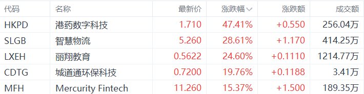 美股异动丨港药数字科技涨47.41%,为涨幅最大的中概股