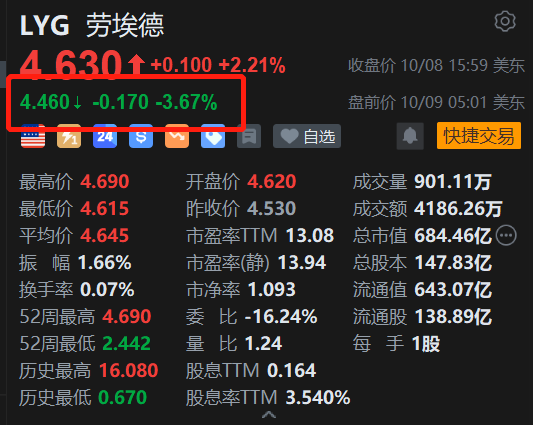 | LYG 劳埃德 | | | | --- | --- | --- | | 4 630 + +0.100 +2.21% | | 收盘价 10/08 15:59 美东 | | 4.460 ↓ -0.170 -3.67% | | 盘前价 10/09 05:01 美东 | | 三四四月四日 中 | | ● 快捷交易 | | 最高价 4.690 开盘价 4.620 | | 成交量 901.11万 | | 最低价 4.615 昨收价 4.530 | | 成交额 4186.26万 | | 平均价 4.645 市空室 IM 13.08 | | 总市值 684.46亿 (--) | | 振 幅 1.66% 市盈率(静) 13.94 | | 总股本 147.83亿 | | 换手率 0.07% | 市净率 1.093 | 流通值 643.07亿 | | 52周最高 4.690 委 比 -16.24% | | 流通股 138.89亿 | | 52周最低 2.442 量 比 1.24 | | 色 主 1路 | | 历史最高 16.080 股息TTM 0.164 | | | | 历史最低 0.670 股息率TIM 3.540% | 1 ...