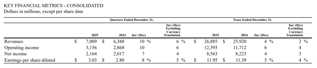 2025年第四季度及全年财务业绩 - 第四季度营业收入70.09亿美元,同比增长6%(剔除汇率影响),超出市场预期 [1] - 第四季度净利润21.64亿美元,同比增长4%(剔除汇率影响)[1] - 全年营业收入268.85亿美元,同比增长2%(剔除汇率影响)[1] - 全年净利润85.63亿美元,同比增长3%(剔除汇率影响)[1] - 第四季度稀释后每股收益3.03美元,同比增长5%(剔除汇率影响)[2] - 全年稀释后每股收益11.95美元,同比增长4%(剔除汇率影响)[2] 同店销售与客流量表现 - 第四季度全球同店销售额增长5.7%,超出市场预期,所有业务板块同店销售额和全球客流量均强劲增长 [2] - 美国市场第四季度同店销售额同比增长6.8%,远超上年同期的-1.4%,增长由客单价和客流量提升驱动 [2] - 国际经营市场第四季度同店销售额增长5.2%,上年同期为0.1%,几乎所有市场均实现增长 [3] - 国际发展许可市场第四季度同店销售额同比增长4.5%,所有地区均实现增长 [4] - 美国市场同店客流与竞争对手的差距达到近年峰值,去年12月已实现低收入群体市场份额增长 [3] 各区域市场运营亮点 - 美国市场增长主要归功于成功的市场推广活动以及基于价值策略的超值套餐与低价产品,持续拉动低收入群体客流 [3] - 国际经营市场中,英国、德国、澳大利亚等核心市场表现突出,均实现中高个位数同店销售增长 [3] - 国际发展许可市场中,日本的同店销售额增长最为显著 [4] - 中国市场尽管面临宏观经济压力,但仍保持市场份额稳定,2025年新增超1000家餐厅,实现全国各省全覆盖 [4] 增长策略与菜单创新 - 公司通过价值策略与客流增长实现了第四季度美国市场利润率的提升,加盟商现金流同比增长 [3] - 针对GLP-1类减肥药物的影响,管理层表示尚未观察到对业务的实质性冲击,并将加强高蛋白产品宣传以应对可能的消费行为变化 [6] - 2026年菜单创新将聚焦牛肉、鸡肉和饮品品类,其中全球鸡肉市场规模为牛肉的两倍且增长更快,公司目标在2026年底将前十市场的鸡肉品类份额较2023年12月提升至少1个百分点 [6] - 饮品品类瞄准全球超1000亿美元市场机遇,计划在美国及部分国际市场推出能量饮料、特调冰咖啡、果味清爽饮、手工苏打水等新品,美国市场还将以“麦咖啡”品牌推出全新饮品系列 [6] 门店扩张与资本支出计划 - 2025年全球系统餐厅总数达45,356家,净新增1,879家,已连续三年年均新增超2000家,2025年新增2,275家 [7][8] - 中国市场门店数从6,820家增至7,740家,净增920家 [8] - 2026年资本支出预计在37亿至39亿美元之间,较2025年增加3-5亿美元,大部分将用于在美国和国际经营市场开设新店 [7] - 新店扩张预计将为2026年系统销售额贡献约2.5%的增长 [7] - 计划2026年新增约2600家餐厅,其中美国及国际经营市场约750家,国际发展许可市场超1800家(含中国约1000家),预计净新增2100家,实现4.5%的门店增长率 [9] - 2027年全球门店目标维持5万家 [9] 2026年业绩指引与近期展望 - 公司预计2026年按固定汇率计算的营业利润率将在40%以上的中高段位 [7] - 管理层预计2026年第一季度各市场同店销售额增速将较去年第四季度有所放缓,主要由于上季度营销活动的高基数、恶劣天气影响客流以及部分餐厅缩短营业时间 [9] - 国际发展许可市场一季度增速放缓还受中国及拉美部分市场宏观压力影响 [9]