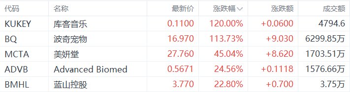 | 代码 | 名称 | 最新价 | 涨跌幅 √ | 涨跌额 | 成交额 | | --- | --- | --- | --- | --- | --- | | KUKEY | 库客音乐 | 0.1100 | 120.00% | +0.0600 | 4794.6 | | BQ | 波奇宠物 | 16.970 | 113.73% | +9.030 | 6299.85万 | | MCTA | 美妍堂 | 27.760 | 45.04% | +8.620 | 1703.51万 | | ADVB | Advanced Biomed | 0.5671 | 24.56% | +0.1118 | 1576.66万 | | BMHL | 蓝山控股 | 3.770 | 22.80% | +0.700 | 3.75万 | 中概股收盘涨幅前五的个股为:库客音乐涨120%,波奇宠物涨113.73%,美妍堂涨45.04%,Advanced Biomed涨25.56%,蓝山控股涨22.8%。(格隆汇) ...
