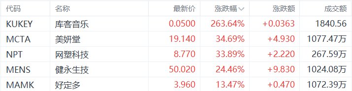 中概股收盘涨幅前五的个股为:库客音乐涨263.64%,美妍堂涨34.69%,网塑科技涨33.89%,健永生技 涨24.46%,好定多涨13.47%。(格隆汇) | 代码 | 名称 | 最新价 | 涨跌幅√ | 涨跌额 | 成交额 | | --- | --- | --- | --- | --- | --- | | KUKEY | 库客音乐 | 0.0500 | 263.64% | +0.0363 | 1840.56 | | MCTA | 美妍堂 | 19.140 | 34.69% | +4.930 | 1077.47万 | | NPT | 网塑科技 | 8.770 | 33.89% | +2.220 | 267.59万 | | MENS | 健永生技 | 50.020 | 24.46% | +9.830 | 1024.08万 | | MAMK | 好定多 | 3.960 | 13.47% | +0.470 | 1072.39万 | ...
