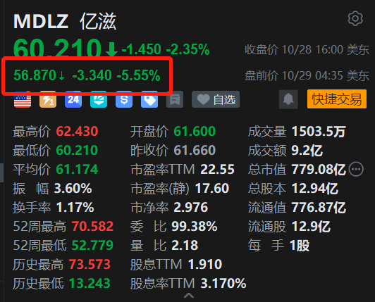 美股异动丨亿滋国际盘前跌5.5% Q3毛利下降 调低全年收益展望