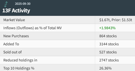 投资组合总览 - 截至2025年9月30日,摩根大通持仓总市值达1.67万亿美元,较上一季度的1.53万亿美元增长[1][2] - 投资组合出现净流入,流入金额占投资组合总市值的比例为+1.9843%[2] - 本季度新增864只个股,增持3144只个股,同时减持2747只个股,清仓527只个股[1][2] - 前十大重仓股占投资组合总市值的26.36%[1][2] 前十大重仓股变动 - **英伟达 (NVDA)**: 超越微软成为第一大重仓股,持股量4.89亿股,持仓市值约911.7亿美元,占投资组合5.46%,持股量环比增长5.63%[3][8] - **微软 (MSFT)**: 位列第二大重仓股,持股量1.59亿股,持仓市值约822.5亿美元,占投资组合4.93%,持股量环比增长1.11%[4][8] - **苹果 (AAPL)**: 位列第三大重仓股,持股量2.37亿股,持仓市值约602.6亿美元,占投资组合3.61%,持股量环比显著增长10.2%[5][8] - **Meta (META)**: 位列第四大重仓股,持股量5471.5万股,持仓市值约401.9亿美元,占投资组合2.41%,持股量环比微降0.01%[6][8] - **亚马逊 (AMZN)**: 位列第五大重仓股,持股量1.83亿股,持仓市值约401.1亿美元,占投资组合2.40%,持股量环比下降5.26%[7][8] - **其他重要持仓**: 包括SPY(持仓比例1.98%)、AVGO(1.86%)、GOOG(1.45%)、IISLA(1.19%)和MA(1.07%)[8] 主要买入与卖出标的 - **前五大买入标的(按持仓比例变化)**: 苹果(持仓比例增加0.73%)、英伟达(增加0.68%)、Alphabet C类股(GOOG,增加0.39%)、Alphabet A类股(GOOGL,增加0.32%)和Palantir(PLTR,增加0.24%)[9][10] - **前五大卖出标的(按持仓比例变化)**: 亚马逊(持仓比例减少0.36%)、iShares核心标普500ETF(IVV,减少0.26%)、Meta(减少0.23%)、奈飞(NFLX,减少0.23%)和Visa(V,减少0.21%)[9][10] - 投资组合调整显示对苹果、英伟达等部分科技巨头的增持,以及对Meta、亚马逊等另一部分科技股的减持[10]