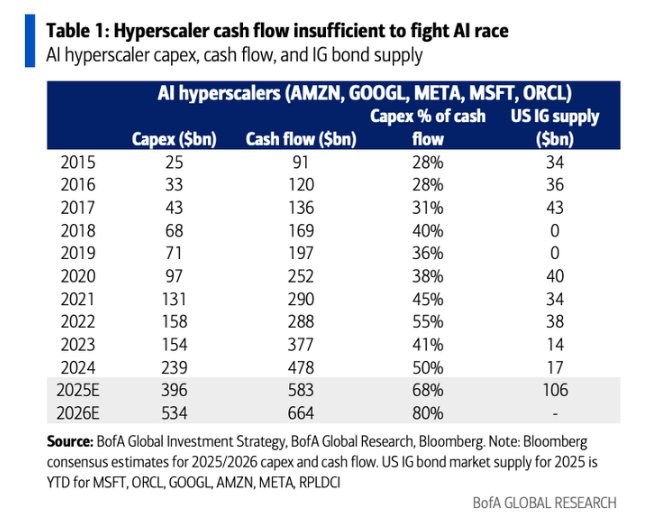 投资策略观点 - 投资者应考虑做空超大规模科技公司的债券,但暂勿大举做空整体人工智能相关交易 [1] 超大规模科技公司财务状况 - 对亚马逊、谷歌、Meta、微软和甲骨文而言,其现金流已不足以支撑AI资本支出军备竞赛 [1] - 资本支出占现金流比例从2015年的28%上升至2025年预计的68%和2026年预计的80% [2] - 过去七周这些公司已发行超1200亿美元债券 [2] - 超大规模科技公司的信用利差已从9月的50个基点扩大至近80个基点 [2] 历史与市场信号 - 在2000年3月互联网泡沫顶峰前的12个月里,美国科技公司债券价格下跌了8% [2] - 市场繁荣与泡沫总会以警惕和离场信号收尾 [4] - AI领域已出现大量警惕信号,包括科技巨头市值集中度飙升,AI相关超大盘股占总市值比重已超40% [4] - 其他警惕信号包括行情广度收窄、AI龙头股市盈率约45倍,以及全球资金与散户大举进场 [4] - 真正的离场信号往往来自利率上升,但当前美联储并未加息,收益率也未大幅飙升 [4]