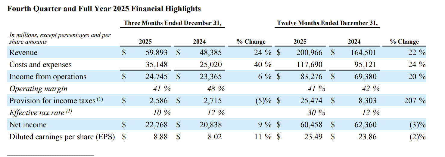 核心观点 - Meta发布2025年第四季度及全年财报 营收及2026年第一季度指引均显著超出市场预期 财报发布后公司股价盘后一度大涨超9% [1] - 分析师认为财报“惊喜远大于惊吓” 主要惊喜来源于对2026年第一季度的强劲收入指引 公司增长预期暂时抵消了对高资本支出的批评 [4][5] 财务业绩表现 - **第四季度业绩**:营收598.9亿美元 同比增长24% 净利润227.7亿美元 同比增长9% 均超出市场预期 [2][4] - **全年业绩**:2025年总营收2009.7亿美元 同比增长22% 净利润604.6亿美元 同比下降3% [2][4] - **盈利能力**:第四季度营业利润247.5亿美元 同比增长6% 营业利润率41% 低于去年同期的48% [2] - **每股收益**:第四季度稀释后每股收益8.88美元 同比增长11% [2] 业务驱动因素 - **广告业务**:第四季度营收增长主要由广告业务推动 广告收入增长24%至581亿美元 占总营收的97% [4] - **AI赋能**:公司在人工智能方面的投入提升了广告投放的精准度和效果 [4] - **产品预期**:2026年第一季度强劲收入指引隐含了对Threads商业化效果的良好预期 以及Reels的强势延续 [4] 未来指引与资本支出 - **收入指引**:管理层预计2026年第一季度收入将增长26%-34% 达到535亿至565亿美元区间 远超市场预期的21%增速 [4] - **资本支出指引**:公司预计2026年资本支出将在1150亿至1350亿美元之间 最高接近2025年722.2亿美元的两倍 [5] - **支出用途**:资本支出增长主要源于为支持Meta超级智能实验室的工作和核心业务而增加的投资 [5] - **利润展望**:尽管基础设施投资大幅增加 但管理层预计2026年的营业利润将高于2025年 [5] 人工智能战略与进展 - **组织调整**:公司高薪挖角人才对人工智能团队进行调整 其AI成果一直受到密切关注 [6] - **模型开发**:公司正在开发代号为Avocado的大语言模型和代号为Mango的图像视频模型 计划在第一季度推出 [5][6] - **实验室进展**:新设立的Meta超级智能实验室已向内部交付首批AI模型 尽管团队成立仅约六个月 但模型表现“非常好”并展现出“很多潜力” [6] - **领导层表态**:公司首席执行官表示已重建AI项目基础 将在未来几个月推出新的模型和产品 并认为2026年AI浪潮将在多个领域进一步加速 [6]