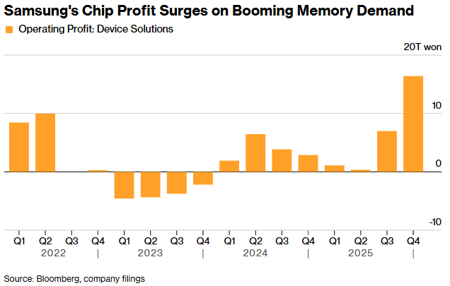 行业核心驱动力:AI资本支出浪潮 - 全球科技巨头对AI支出意愿强烈,创纪录的资本支出浪潮正推动硬件供应商发展 [1] - 仅Meta一家公司就计划2024年资本支出高达1350亿美元,为商业领域规模最大的计划支出之一 [1] - 超大规模云服务商(如Meta、微软、亚马逊、Alphabet)正在全球范围内推动对芯片、服务器和计算机的采购浪潮 [1] - 市场对AI硬件的需求旺盛,且这一势头很可能延续到2026年 [1] 硬件供应商的积极回应与业绩 - 存储芯片制造商三星电子和SK海力士计划“大幅增加”资本支出并加大存储芯片生产能力投入 [1] - 三星芯片部门报告利润增长了五倍,远高于分析师平均预期 [4] - 三星宣布将回购3.57万亿韩元股票,并派发特别股息,使其第四季度派息总额达到3.75万亿韩元 [4] - 光刻机供应商ASML业绩远超预期 [2] 存储芯片市场的结构性变化与竞争 - 存储芯片制造商正将生产线转向利润丰厚的高带宽内存以满足AI数据中心需求 [3] - 生产相同容量的HBM所需晶圆产能约为标准DRAM的三倍,这一转变减少了消费电子行业的供应 [3] - 三星计划于2月份开始出货其下一代高带宽内存HBM4,以追赶SK海力士在该领域的领先地位 [3] - 三星即将获得英伟达对其最新版本AI存储芯片的认证 [7] 半导体代工业务的增长前景 - AI建设热潮有助于支撑三星的代工业务,该业务正与行业领头羊台积电竞争 [7] - 三星的合同芯片制造部门预计2026年2纳米订单将增长约130% [7] - 公司目前正与美国和中国的客户就先进制程进行积极讨论 [7] 市场需求与潜在风险 - 巨大的AI硬件需求正在加剧全球芯片供需失衡,威胁到智能手机、电子产品及汽车制造等多个行业 [2] - 投资者担心基础存储芯片会出现类似AI加速器的供不应求情况 [2] - 存储芯片产能转向HBM可能导致个人电脑制造商和小型电子公司面临两位数的涨价 [3] - 特斯拉CEO埃隆·马斯克表示,半导体供应将成为公司增长的一大瓶颈,可能使建立自有芯片工厂变得必要 [2] 科技巨头的业绩与市场反应 - 只要公司能够展示增长,投资者就会回报其雄心,例如Meta在公布支出计划后股价上涨6.6% [1] - 微软在披露云计算服务增长放缓后,股价下跌了6.1% [1] - 微软本季度资本支出增长66%超出预期,但其Azure云计算部门营收增长38%,较前三个月放缓一个百分点 [3] - Meta首席执行官马克·扎克伯格谈到科技行业正在经历“重大AI加速”,并强调公司处于快速发展轨迹 [3]