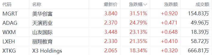 | 代码 | 名称 | 最新价 | 涨跌幅 ▽ | 涨跌额 | 成交额 | | --- | --- | --- | --- | --- | --- | | MGRT | 美华创富 | 3.840 | 31.51% | +0.920 | 154.83万 | | ADAG | 天演药业 | 2.370 | 24.79% | +0.471 | 49.96万 | | WXM | 山友国际 | 3.448 | 23.13% | +0.648 | 18.39万 | | LXEH | 丽翔教育 | 2.330 | 21.35% | +0.410 | 58.72万 | | XTKG | X3 Holdings | 2.065 | 18.34% | +0.320 | 666.81万 | 中概股收盘涨幅前五的个股为:美华创富涨31.51%,天演药业涨24.79%,山友国际涨23.13%,丽翔教 育涨21.35%,X3 Holdings涨18.34%。(格隆汇) ...