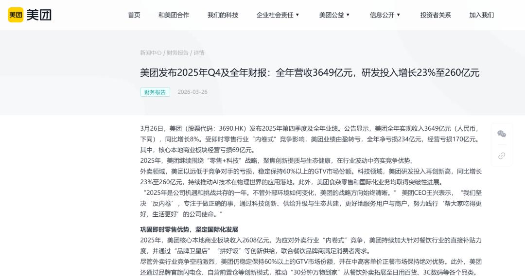 2025年第四季度及全年业绩概览 - 全年实现收入3649亿元人民币,同比增长8% [2] - 全年净亏损234亿元人民币,经营亏损170亿元人民币,核心本地商业板块经营亏损69亿元人民币 [2] - 第四季度营业收入920.06亿元人民币,同比增长4.1%;经调整净亏损150.8亿元人民币,上年同期为净利润98.49亿元人民币 [2] - 截至3月26日港股收盘,公司股价86.7港元,对应总市值5353亿港元 [3] 财务表现与业务展望 - 预计2026年第一季度餐饮外卖的单均亏损环比优化幅度会好于2025年第四季度,减亏趋势将持续 [2] - 一季度至今,公司继续保持在中高价订单市场GTV的领先地位 [2] - 2025年新业务板块(含食杂零售及海外业务)收入1040亿元人民币,同比增长19% [7] - 预计2026年新项目的整体亏损不会超过2025年,但整体亏损将依然存在 [8] AI战略与投入 - 2025年全年研发投入260亿元人民币,同比增长23% [4] - 公司自2023年初以来在AI上进行了大规模投入,除有云计算业务的企业外,其AI投入规模大概率是国内企业中最大的,已坚持布局三年多 [4] - 公司正继续投入自研基座大模型LongCat,并与行业顶尖的第三方大模型合作 [4] - 公司认为AI“超级入口”的复杂程度远超“聊天机器人”,关键在于精准理解用户需求并高效执行任务 [5] AI产品“小团”与本地生活应用 - 公司已面向所有用户开放了嵌入美团APP的AI助手“小团”,覆盖了美团本地生活的全品类 [5] - “小团”基于物理世界的海量信息,可从全网评价中提炼有价值信息并推理出满足个性化需求的答案 [6] - 公司计划持续优化模型能力,深化“小团”在APP内的融合,强化AI搜索与执行能力,目标是让美团APP成为用户解决本地生活需求的首选平台和AI入口 [6] 即时零售与生鲜电商布局 - 近期收购叮咚买菜大陆业务,旨在提升生鲜电商零售领域能力、强化供应链实力,并提升整体零售业务的运营效率 [6] - 收购有助于公司在华东地区显著扩大覆盖范围并提升服务质量,这是其长期战略重点 [6] - 小象超市保持了强劲的增长势头,通过扩展自有品牌商品、覆盖夜间消费场景,保持业内领先的履约速度和体验 [7] - 公司相信小象超市代表了一种可明确实现盈利的模式,并计划将该模式推广至更多城市和地区 [7] 国际化业务进展 - 海外业务品牌Keeta在中东海湾地区已完成主要国家的覆盖,并在巴西展业 [8] - Keeta在香港已于2025年10月份实现盈利,仅用29个月就实现了单月UE(单位经济效益)转正 [8] - Keeta在沙特阿拉伯有望在2026年底前实现单月UE转正,预计将比香港更快实现 [8] - 在中东地区削减补贴后,单量依旧非常稳定;在巴西的运营重点是圣保罗,优先发展和完善南圣保罗以打造差异化优势 [8]
