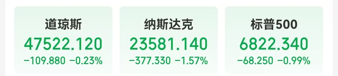 当地时间10月30日,美股三大指数集体收跌,纳指下跌377.33点,跌幅1.57%;标普500指数跌0.99%;道指跌0.23%。 Meta跌超11%,市值一夜蒸发2140亿美元(约合人民币15216亿元)。为三年以来最大单日跌幅,创6月份以来新低。公司第三财季净利润为27亿美元,远 低于分析师预期,公司计划通过债券发行筹集至少250亿美元。 谷歌涨超2%。公司三季度营收、利润以及全年资本开支指引均超出分析师预期,多个主要业务实现两位数百分比增幅。 特斯拉跌超4%,市值一夜蒸发712亿美元(约合人民币5063亿元)。 微软、英伟达跌超2%;奈飞跌超1%。 临床阶段生物技术公司Metsera Inc.(MTSR)大涨超22%,创上市以来新高。美股数字货币概念股下跌,嘉楠科技跌超9%,Coinbase Global、MARA Holdings跌超5%。 亚马逊第三季度净销售额1801.7亿美元,预估1778.2亿美元;第三季度经营利润174.2亿美元,预估197.2亿美元;第三季度净利润211.9亿美元;第三季度每 股收益1.95美元,预估1.58美元。AWS净销售额330.1亿美元,同比增长20%,预估323. ...
