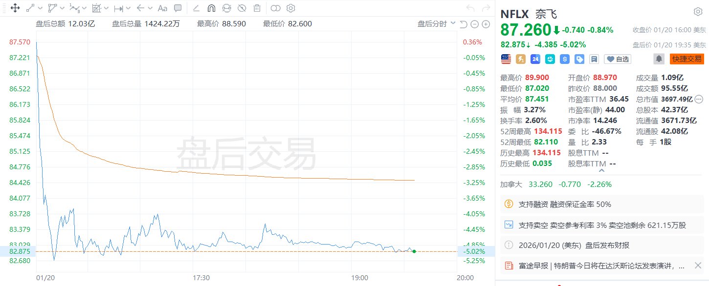 市场整体表现 - 美国股市遭遇自10月以来最差单日表现 市值单日蒸发约1.4万亿美元 [1][11] - 主要股指大幅下跌 道琼斯工业平均指数下跌1.8% 损失超过800点 标准普尔500指数下跌约2% 纳斯达克综合指数下跌超过2.4% [2][11] - 标准普尔500指数和纳斯达克综合指数的年内涨幅被全部抹去 [2][11] 市场下跌驱动因素 - 市场下跌主因是特朗普总统将新的关税威胁与收购格陵兰的意图挂钩 引发对美欧贸易冲突扩大的担忧 [1][3][10] - 特朗普威胁对八个北约国家征收10%的进口关税 除非美国达成收购格陵兰的协议 [3][11] - 欧盟讨论可能实施1080亿美元的报复性关税 并考虑一项可能影响高达8万亿美元美国资产的“反胁迫工具” [3][11][12] - 特朗普还警告对法国葡萄酒征收200%的关税 [5][12] 债券与避险资产反应 - 美国国债收益率升至四个月高位 日本债券市场的抛售压力蔓延至美国债市 [5][12] - 美元跌至两周低点 [5][12] - 黄金和白银价格创下历史新高 投资者转向避险资产 [5][11][12] 行业与公司表现 - 大型科技股下跌 英伟达和博通领跌 投资者减少对人工智能相关股票的敞口 [6][12] - Netflix股价在公布第四季度业绩后小幅上涨 其营收为120.5亿美元 高于119.6亿美元的预期 每股收益为0.56美元 略高于预期 [7][12] - Netflix表示将增加内容支出并暂停股票回购 因其对华纳兄弟探索公司的收购悬而未决 并将收购要约改为全现金形式 [8][12] 后续市场焦点 - 市场焦点转向达沃斯世界经济论坛 特朗普定于周三会见全球领导人并发表重要讲话 [9][12] - 投资者将密切关注贸易谈判、企业财报更新和债券市场动向 [9][12]