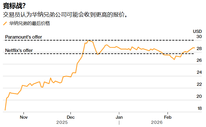 竞购大战或升级!市场定价华纳兄弟(WBD.US)收购报价有望再提高