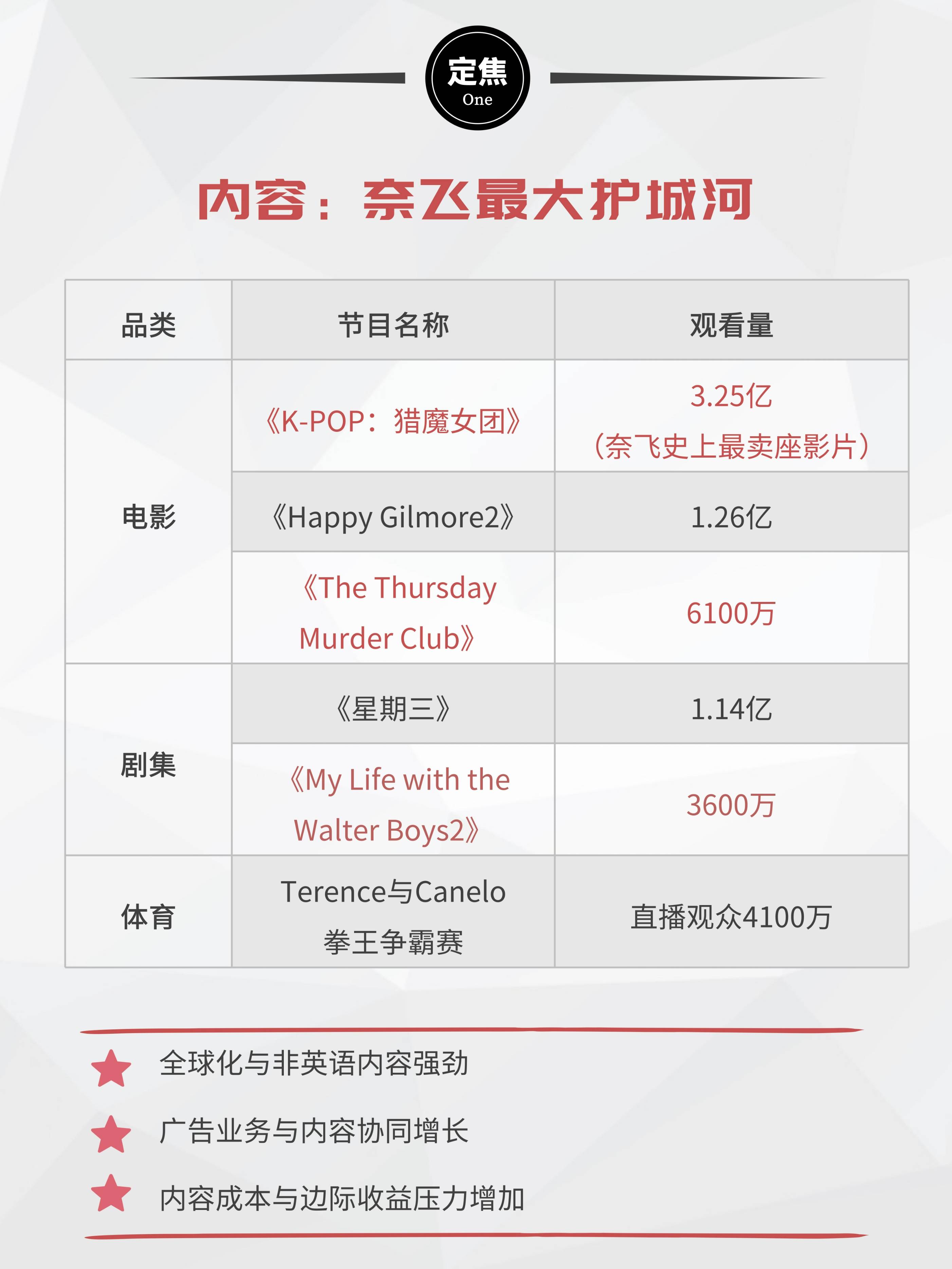 三季度,拥有"史上最强内容"的奈飞(Netflix),却交出了一份令华尔街失望的财报。 奈飞的营收依然亮眼。财报显示,奈飞Q3营收达115.10亿美元,同比增长17.2%,增长主要来自会员增长、定价上涨和广告收入推动。其中广告业务表现突 出,本季度创下"史上最佳广告销售"纪录,奈飞预计2025年广告收入将翻倍。 但盈利指标却全面下滑: 净利润25.47亿美元,低于市场预期的30亿美元,增速从二季度的45.6%骤降至7.7%。 营业利润为32.4亿美元,营业利润率为28%,均低于市场预期。奈飞将利润率下滑主要归因于一项一次性支出:与巴西税务机关的纠纷导致计提6.19亿美元 的费用。 每股收益5.87美元,低于预期的6.94美元。 财报发布后,股价盘后下跌6.5%。奈飞股价曾在6月30日创历史新高,盘中逼近1340美元,此后震荡下行。 从内容来看,奈飞本季度依旧强势。《Kpop:猎魔女团》成为平台史上最卖座电影,《星期三》等剧集热度不减,拳击直播吸引超4100万观众。奈飞称用 户参与度达历史峰值。 引发市场焦虑的原因在于其增长的可持续性。 奈飞自2025年起不再披露"订阅会员净增"数据,转而强调营收与参与度。分析 ...