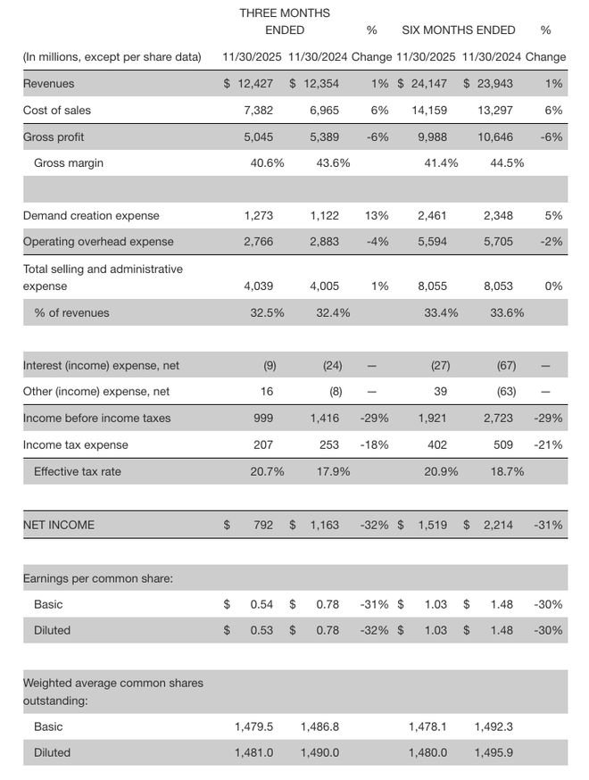 当地时间12月18日,耐克公司公布截至2025年11月30日的2026财年第二季度财务业绩:营收为124.27亿 美元,同比增长1%;毛利率同比下降300个基点至40.6%,主要是由于更高的北美关税;净利润为7.92 亿美元,同比下降32%,摊薄后每股收益为0.53美元。 | | | THREE MONTHS | | | | | | | | --- | --- | --- | --- | --- | --- | --- | --- | --- | | | | ENDED | | % | SIX MONTHS ENDED | | | % | | (In millions, except per share data) | | | | 11/30/2025 11/30/2024 Change 11/30/2025 11/30/2024 Change | | | | | | Revenues | | $ 12,427 | $ 12,354 | | 1% $ 24,147 | $ 23,943 | | 1% | | Cost of sales | | 7,382 | 6,965 | 6% | 14.159 | 13, ...