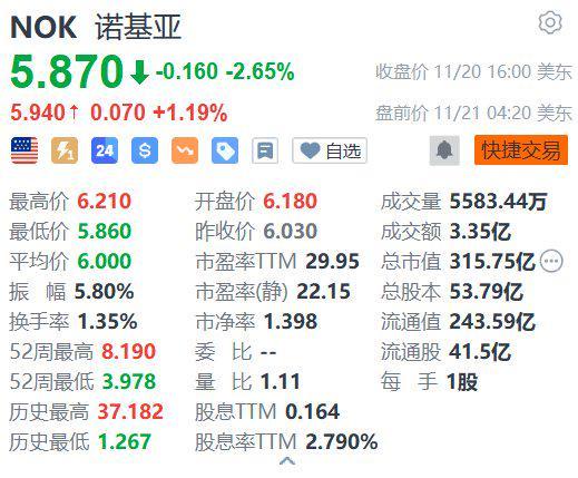 诺基亚(NOK.US)盘前涨1.19%报5.94美元。有市场消息称,诺基亚首席执行官Justin Hotard表示,公司 正在评估的四大业务单元——包括其私有无线网络解决方案——与整体战略方向不符,预计将在2026年 推进相关业务的剥离或出售。此外据悉,诺基亚正押注人工智能热潮,精简业务以聚焦连接AI数据中 心的网络基础设施。该公司周三举办资本市场日。诺基亚宣布,到2028年其年度营业利润预计将在27亿 欧元至32亿欧元。(格隆汇) | NOK 诺基亚 | | | | --- | --- | --- | | 5.8704-0.160 -2.65% | | 收盘价 11/20 16:00 美东 | | 5.940 + 0.070 +1.19% | | 盘前价 11/21 04:20 美东 | | 一 5 24 9 ~ 9 日 ♥ 白选 | | ● 快捷交易 | | 最高价 6.210 | 开盘价 6.180 | 成交量 5583.44万 | | 最低价 5.860 | 昨收价 6.030 | 成交额 3.35亿 | | 平均价 6.000 | | 市盈率TTM 29.95 总市值 315.75亿 … | | 振 ...