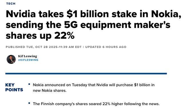 美股异动|昨日因获英伟达投资暴涨超22%后,诺基亚回调跌超5%