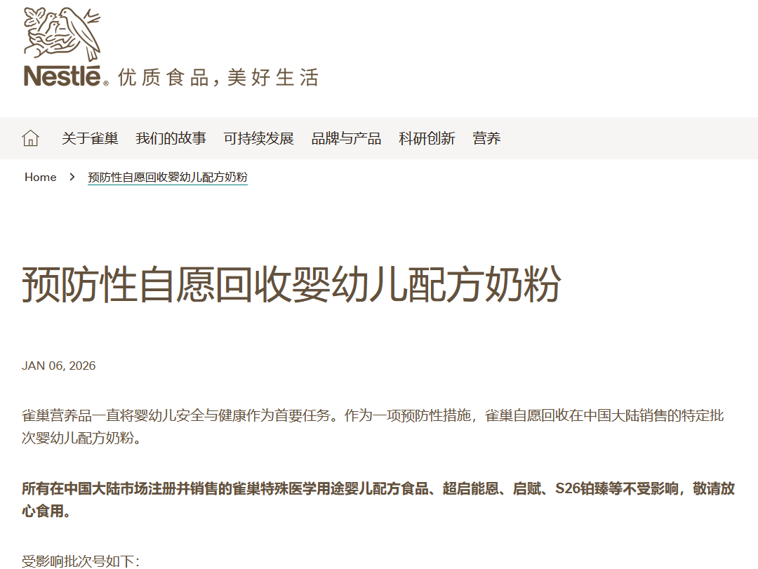 (文章来源:中国新闻网) 雀巢公司还表示,目前尚未收到与该产品相关的确诊病例报告,但出于谨慎考虑,仍决定召回相关产 品。(完) 中新网1月6日电据BBC报道,因部分婴儿配方奶粉产品可能含有引发食物中毒的毒素,雀巢公司已发布 全球召回令。 雀巢公司表示,其特定批次的SMA婴儿配方奶粉及后续配方奶粉不适合喂养婴儿,这些批次产品销往 全球各地,或含有摄入后会引发恶心、呕吐症状的物质。 ...