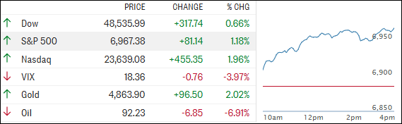 市场整体表现 - 主要股指延续昨日涨势,纳斯达克指数领涨,科技股继续支撑大盘 [1] - 标普500指数完全收复与伊朗相关的跌幅,纳斯达克指数收于日内高点 [3] - “七巨头”股票表现强劲,当日上涨3%,跑赢标普500指数中其余493只股票,在过去10个交易日中有9日上涨 [3] 板块与个股动态 - 科技股表现突出:甲骨文股价大涨7%,英伟达和Palantir股价持续攀升 [1] - 金融股业绩分化:富国银行因业绩令人失望下跌超5%,摩根大通业绩超预期但下调了净利息收入指引 [2] - 金属板块普遍上涨:白银表现突出,大涨5.5%,黄金上涨2.2%,铜价在昨日大涨后继续上涨1.3% [8] 大宗商品与外汇市场 - 油价逆转走势下跌约5%,西德克萨斯中质原油交易价格高于每桶93美元 [2] - 黄金价格突破每盎司4800美元,创下自3月中旬以来的最高水平 [3] - 比特币价格飙升,突破76000美元,创下自战争开始以来的最高水平 [3] 市场情绪与催化剂 - 市场对特朗普总统关于伊朗“非常希望达成协议”的言论感到鼓舞,尽管和平谈判遭遇挫折,市场仍在对某种解决方案的可能性进行定价 [2] - 债券收益率下降,美元走弱 [3] - 交易员关注即将到来的大规模期权到期日,这可能引发额外的市场波动 [4] 趋势跟踪指数 - 国内趋势跟踪指数收于其移动平均线上方4.80%,高于前一收盘的4.37%,买入信号于2025年5月20日生效 [8] - 国际趋势跟踪指数收于其移动平均线上方7.99%,高于前一收盘的7.41%,买入信号于2025年5月8日生效 [9] - 国际趋势跟踪指数在2025年4月4日跌破关键阈值后发出“卖出”建议,后随全球市场复苏而反转,于2025年5月8日发出新的“买入”信号 [6]