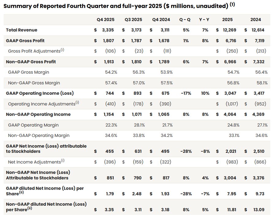 核心观点 - 恩智浦2025年第四季度业绩整体超预期 但核心汽车业务增长略逊于预期 导致股价盘后下跌近5% [1] - 公司对2026年第一季度营收指引的中值高于市场预期 显示管理层对未来业绩持相对乐观态度 [1][5] 财务业绩总结 (2025年第四季度及全年) - **营收表现**:2025年Q4总营收为33.4亿美元 同比增长7% 环比增长5% 超出分析师平均预期的33亿美元 [1][2] - 2025年全年总营收为122.7亿美元 较2024年的126.1亿美元有所下降 [2] - **盈利能力**: - Non-GAAP毛利润为19.1亿美元 同比增长7% 毛利率为57.4% [1][2] - Non-GAAP营业利润为11.5亿美元 同比增长8% 营业利润率为34.6% [1][2] - Non-GAAP摊薄后每股收益为3.35美元 同比增长5% 环比增长8% 超出分析师平均预期的3.31美元 [1][2] - 2025年全年Non-GAAP摊薄后每股收益为11.81美元 [2] - **GAAP指标**:GAAP净利润为4.55亿美元 同比下降8% 环比下降28% GAAP摊薄后每股收益为1.79美元 [2] 分业务营收表现 (2025年第四季度) - **汽车业务**:营收为18.8亿美元 同比增长5% 环比增长2% 但未达到分析师平均预期的18.9亿美元(部分预期高达19.7亿美元)[1][2][3] - **工业与物联网业务**:营收为6.4亿美元 同比增长24% 环比增长11% [1][2][3] - **移动业务**:营收为4.9亿美元 同比增长22% 环比增长13% [1][2][3] - **通信基础设施及其他业务**:营收为3.3亿美元 同比下降18% 环比增长2% [1][2][3] - **业务结构**:汽车业务是公司核心 贡献超过一半营收 其芯片主要用于驾驶安全、车联网及车载信息娱乐系统 [3] 行业背景与公司展望 - **行业环境**:公司及其同行(如意法半导体、德州仪器)仍受疫情后芯片供应过剩影响 汽车和消费电子客户正在缓慢消化库存 特朗普的关税威胁进一步推迟了行业复苏进程 [4] - **复苏信号**:公司此前曾表示供应过剩可能接近尾声 并指出汽车业务在“显著”加速 新任CEO也看到了“周期性复苏的迹象” [4] - **同业动态**:意法半导体近期给出了高于预期的Q1营收指引 主要因消费电子需求回升 但其CEO指出汽车市场“尚未稳定” [5] - **业绩指引**:公司预计2026年Q1营收区间为30.5亿至32.5亿美元 中值31.5亿美元 高于分析师平均预期的30.9亿美元 预计Non-GAAP摊薄后每股收益区间为2.77至3.17美元 中值2.97美元 略高于分析师平均预期的2.95美元 [5]