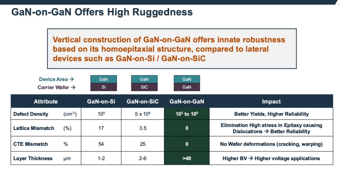 垂直氮化镓(vGaN)技术突破 - 垂直结构氮化镓(vGaN)通过将电流路径从横向改为垂直,能在不扩大芯片尺寸的前提下提升击穿电压,并将峰值电场与热量转移至体衬底,从而优化可靠性与热管理 [1] - vGaN器件的击穿电压可突破650V限制,目标应用10kW至10MW高功率场景,如AI数据中心800V系统、电动汽车和储能领域 [1] - 安森美已向早期客户提供700V和1200V的vGaN器件样品,技术演示可实现最高3300V的电压等级 [1][10] 安森美vGaN技术优势与制造能力 - 公司采用GaN-on-GaN同质外延结构,缺陷密度低至10³至10⁵ cm²,晶格失配为0,显著优于GaN-on-Si(缺陷密度10⁹ cm²,失配17%)和GaN-on-SiC(缺陷密度5x10⁸ cm²,失配3.5%),带来更高良率和可靠性 [3] - 研发团队拥有超过15年技术积累和130多项专利,在66,000平方英尺专用洁净室进行生产,核心工艺为专有GaN生长技术,可直接在GaN晶圆上生长厚度超过40微米的无缺陷GaN层 [3] - 公司掌握图案化表面上p型GaN(pGaN)再生长技术并拥有多项专利,该技术难度极高 [3] - 器件采用结型场效应晶体管(e-JFET)形式,实现较低的整体导通电阻和完整的雪崩能力 [8] vGaN与传统材料性能对比 - 与硅(Si)和碳化硅(SiC)相比,氮化镓(GaN)材料具有更宽的禁带宽度(3.4 eV)、更高的电子迁移率(2000 cm²/V.s)和更高的临界电场(3.3 MV/cm) [14] - GaN的品质因数(BFOM)达到9932 W/cm²,远高于SiC的3922 W/cm²和Si的1 W/cm²,使其适用于更高开关频率和击穿电压的场景 [14] - vGaN技术能降低能量损耗、减少热量产生,使功率转换器尺寸缩小至平装书大小,实现系统小型化与高集成度 [10] 行业竞争格局与厂商动态 - 安森美于2025年1月以2000万美元收购了已破产的vGaN公司NexGen Power Systems,包括其知识产权和位于纽约州德威特的制造工厂 [2] - 2024年5月,Power Integrations收购了vGaN公司Odyssey,后者曾宣称其650V和1200V vGaN器件的导通电阻仅为SiC的十分之一 [23] - 新成立的公司Vertical Semiconductor近期获得1100万美元种子轮融资,致力于将源自MIT实验室的vGaN技术应用于数据中心 [30] - 博世参与由超过20家工业伙伴组成的"YESvGAN"项目,旨在推动vGaN半导体技术突破 [26] 技术实现路径与学术进展 - 实现vGaN器件的主要方法包括沟槽MOSFET、FinFET、JFET、垂直肖特基二极管和电流孔径垂直电子晶体管(CAVET) [20][21] - 山东大学与华为合作研发出采用氟离子注入终端技术的全垂直Si基GaN沟槽MOSFET,击穿电压从567V提升至1277V,增幅超125%,比导通电阻为5.6 mΩ·cm² [33][34] - 信越化学通过GaN工程衬底和晶体膜键合(CFB)衬底剥离技术,有望将材料成本降低90%,并实现了1800V耐压 [25]