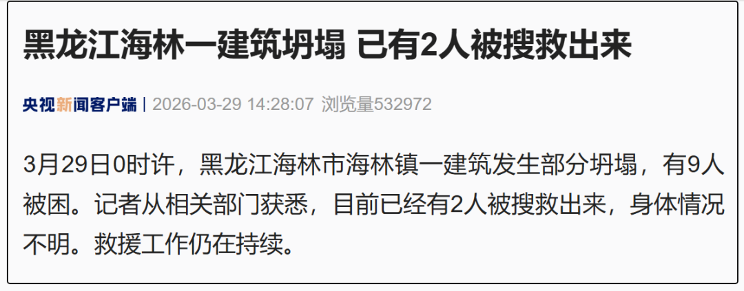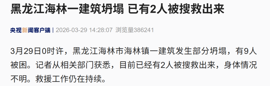黑龙江海林一建筑坍塌9人被困,已有2人被救出,身体情况不明,救援工作仍在持续