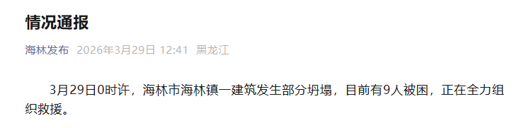 事件概述 - 2024年3月29日0时许,黑龙江省海林市海林镇一建筑发生部分坍塌[1] - 事件导致9人被困,现场正在全力组织救援[1] 救援进展 - 海林市应急管理局等部门在事件发生后第一时间赶往现场[1] - 截至3月29日11时,多部门仍在现场全力救援,未接到人员伤亡报告[1]
