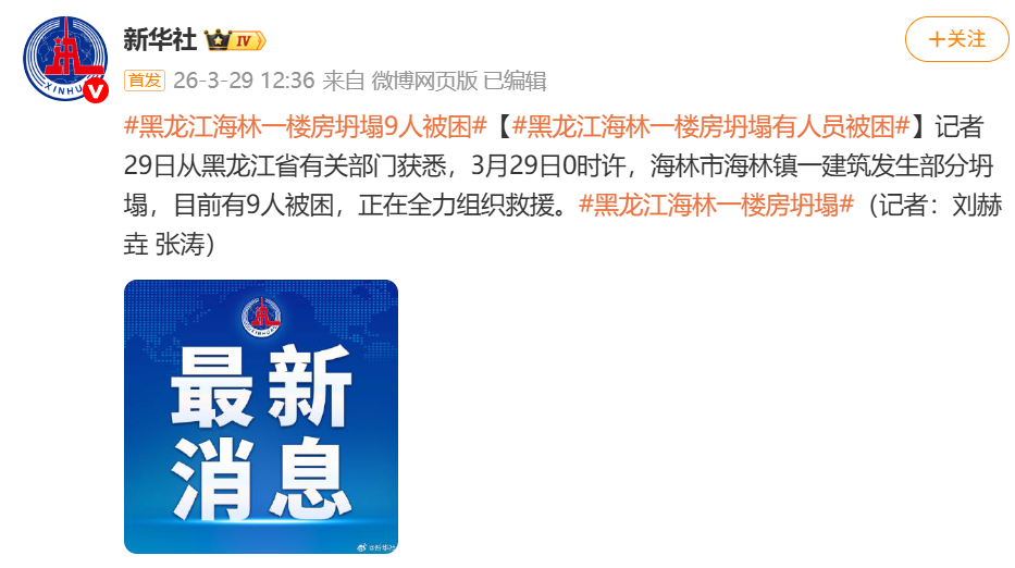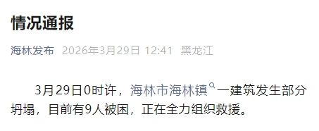 事件概述 - 2026年3月29日0时许 黑龙江省海林市海林镇一建筑发生部分坍塌[1] - 事故导致9人被困 目前正在全力组织救援[1]