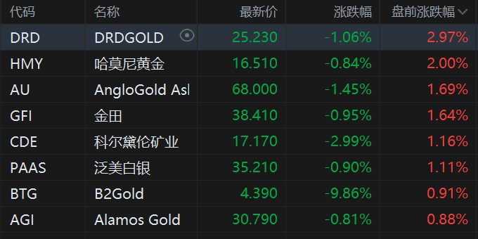 美股黄金概念股盘前下跌