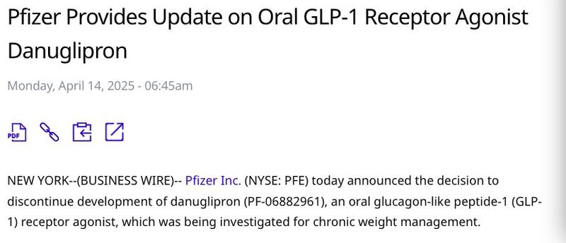 公司研发管线更新 - 辉瑞宣布终止口服GLP-1受体激动剂Danuglipron用于慢性体重管理的研发[1][3] - 终止决定基于对全部临床试验数据及监管反馈的综合评估 其中优化剂量研究中出现一例无症状的潜在药物性肝损伤病例 停药后恢复[3] - 此前辉瑞已终止口服GLP-1候选药物Lotiglipon的开发 目前仅剩一款口服GIPR拮抗剂处于二期临床阶段[1][4] - Danuglipron的临床开发数据未来将在科学论坛展示或提交期刊发表[4] 药物临床数据与历史 - Danuglipron每日口服一片的优化剂量研究已达到关键药代动力学目标 早期每日两次给药的数据显示其可能在三期临床中呈现有竞争力的疗效与耐受性[3] - 在超过1400名受试者的安全性数据中 肝酶升高的总体发生率与已获批同类药物相当[3] - 2023年12月 因患者耐受度不佳 辉瑞终止了Danuglipron每日两次的临床研究 但决定继续推进每日一次的药代动力学研究[4] - 2023年6月 基于安全性考量 辉瑞终止了口服GLP-1候选药物Lotiglipon的开发[4] 公司战略与业绩背景 - 辉瑞将心血管与代谢性疾病(包括肥胖症)视为存在未满足医疗需求的领域 计划继续推进相关疗法管线 包括口服GIPR拮抗剂及其他早期肥胖症项目[3] - 公司CEO曾表示正“全力以赴”开发实验性减肥药 并视其为下一个重大产品 预计年销售额可能达100亿美元[6] - 2023年辉瑞营收同比下滑41.7% 至584.96亿美元 主要因新冠产品助力减弱[5] - 2024年公司营收同比增长7% 至636.27亿美元 若剔除新冠产品影响 营收增长12%[6] - 为提振业绩 公司采取了包括以430亿美元收购Seagen在内的多项措施 Seagen在2024年贡献了超过34亿美元营收[5][6] 行业市场展望 - GLP-1药物领域是当下热点 存在千亿美元规模的减肥药市场[1] - 在现有研发遇阻后 向外寻找商业合作可能成为辉瑞的考量选项[6]