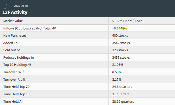 投资组合概况 - 截至2025年9月30日的第三季度持仓总市值达1.65万亿美元,较上一季度的1.54万亿美元环比上升7.1% [1] - 投资组合新增400只个股,增持3542只个股,减持3456只个股,清仓328只个股 [1] - 前十大持仓标的占总市值的21.93% [1] - 投资组合周转率为8.58% [2] 前五大重仓股持仓变动 - 微软位列第一,持仓1.20亿股,市值约622.8亿美元,占投资组合3.77%,持仓数量较上季度增加0.96% [3] - 英伟达位列第二,持仓3.23亿股,市值约602.6亿美元,占投资组合3.65%,持仓数量较上季度减少0.85% [3] - 苹果位列第三,持仓2.29亿股,市值约583.4亿美元,占投资组合3.53%,持仓数量较上季度减少1.76% [4] - 亚马逊位列第四,持仓1.63亿股,市值约357.6亿美元,占投资组合2.16%,持仓数量较上季度增加1.47% [4] - 谷歌位列第五,持仓1.22亿股,市值约296.4亿美元,占投资组合1.79%,持仓数量较上季度减少9.33% [4] 重点买入与卖出标的 - 前五大买入标的为:景顺纳指100ETF、SPDR标普500指数ETF、景顺MSCI美国ETF、Vanguard标普500指数ETF、强生 [5] - 前五大卖出标的为:Visa、Meta、埃森哲、开市客、赛富时 [5] - 增持SPDR标普500指数ETF 3,703,801股,变动比例10.02%,持仓市值达270.8亿美元 [7] - 增持Vanguard标普500指数ETF 2,130,431股,变动比例9.14%,持仓市值达155.9亿美元 [7] - 增持景顺纳指100ETF 4,198,148股,变动比例20.62%,持仓市值达147.4亿美元 [7] 行业与个股配置调整 - 对美股科技七巨头,仅增持微软与亚马逊,减持了苹果、英伟达、Meta、谷歌与特斯拉 [6] - 减持部分明星AI股,如甲骨文、博通与Palantir [6] - 加仓美国能源巨头埃克森美孚,增持771,438股,变动比例1.04%,持仓市值达84.5亿美元 [7] - 加仓美国能源巨头雪佛龙,增持3,048,508股,变动比例9.08%,持仓市值达56.8亿美元 [7] - 增持医疗保健股强生11,317,357股,变动比例2.13% [7]