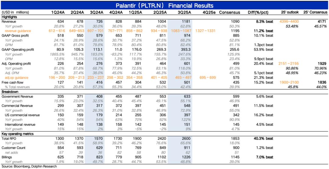 核心业绩表现 - 第三季度总营收达11.81亿美元,同比增长63%,超过华尔街预期的10.9亿美元以及公司自身指导的10.83亿至10.87亿美元 [4][5] - 第三季度GAAP净收入为4.76亿美元,同比增长231%,调整后净收入为5.29亿美元,同比增长119% [4] - 第三季度GAAP每股收益为0.18美元,同比增长217%,调整后每股收益为0.21美元,同比增长110%,超过华尔街预期的0.17美元 [4][5] - 公司当季产生经营现金流5.08亿美元,同比增长20%,调整后自由现金流为5.4亿美元,同比增长24% [6] 各业务板块表现 - 商业业务收入增长73%至5.48亿美元,占总营收的46%,其中美国商业收入飙升121%至3.97亿美元 [1][7][9] - 政府业务收入增长55%至6.33亿美元,占总营收的54%,其中美国政府收入增长52%至4.86亿美元 [7][9] - 美国地区营收增长77%至8.83亿美元,占总营收的75%,非美国地区营收占比为25% [7] 客户与合同增长 - 总客户数量同比增长45% [9] - 共完成204笔价值超过100万美元的交易,91笔至少500万美元的交易,以及53笔至少1000万美元的交易 [9] - 美国商业客户数量激增65%至530家 [9] - 美国商业总合同价值(TCV)交易额飙升342%至13.1亿美元,剩余交易价值猛增199%至36.3亿美元 [9] 财务指导与展望 - 第四季度营收指导为13.27亿至13.31亿美元,相当于同比增长60%至61%,超过华尔街预期的11.8亿美元 [8][9] - 将2025全年总营收指导从41.42亿至41.5亿美元上调至43.96亿至44亿美元,隐含同比增长率从45%提升至53% [8] - 将2025年美国商业收入指导从至少13.02亿美元上调至至少14.33亿美元,隐含同比增长率从至少85%提升至至少104% [8] - 将2025年调整后运营收入指导从19.12亿至19.2亿美元上调至21.51亿至21.55亿美元,隐含同比增长率从69%-70%提升至90%-91% [8]
