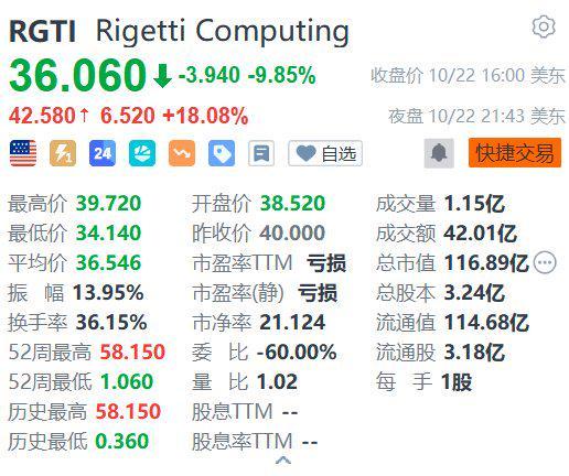 格隆汇10月23日|量子计算公司D-Wave Quantum在夜盘交易中涨超17%,Rigetti Computing涨18%。消 息面上,美国总统特朗普政府正商谈入股量子计算公司,这表明特朗普政府正在扩大对其认为至关重要 的经济领域的干预。量子计算公司正讨论向美国政府提供股权以换取芯片研发资金,参与美国政府入股 谈判的量子公司包括IonQ,Rigetti Computing,D-Wave Quantum等。 | RGTI Rigetti Computing | | | | --- | --- | --- | | 36.060 4 -3.940 -9.85% | | 收盘价 10/22 16:00 美东 | | 42.580 + 6.520 +18.08% | | 夜盘 10/22 21:43 美东 | | ■ 72 24 4 ~ ~ 日 ◎ 品 ◎ 品 ◎ 品 ◎ 品 ◎ 品 ◎ 品 ◎ 品 ◎ 品 ◎ 品 。 | | ● 快捷交易 | | 最高价 39.720 | 开盘价 38.520 | 成交量 1.15亿 | | 最低价 34.140 | 昨收价 40.000 | 成交额 42.01亿 | | 平均价 ...