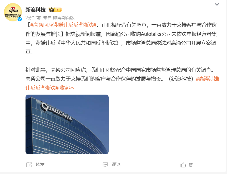 高通回应涉嫌违反反垄断法:正积极配合有关调查,一直致力于支持客户与合作伙伴的发展与增长