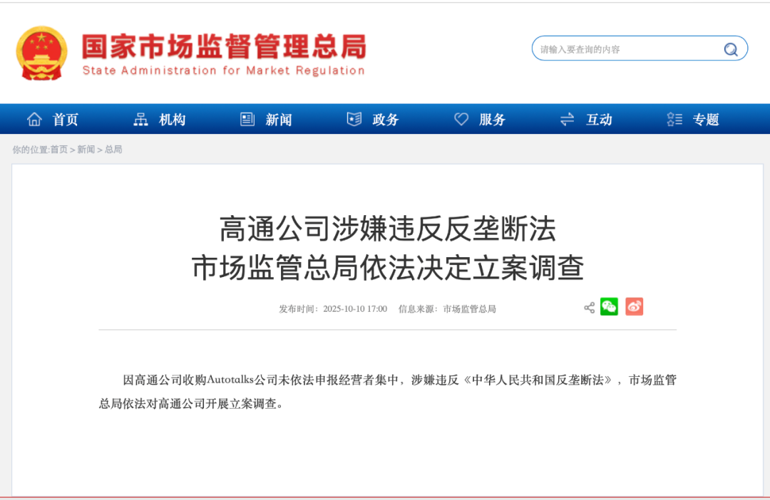 SFC 来源丨国家市场监管总局网站、公开信息 10月10日,据国家市场监管总局网站消息,因高通公司收购Autotalks公司未依法申报经营者集中,涉嫌违反《中华人民共和国反垄断法》,市场监管总局 依法对高通公司开展立案调查。 截至北京时间17:09,高通美股盘前跌2.91%。 ...