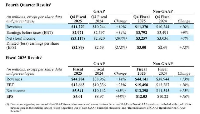 11 月 6 日消息,高通发布第四财季财报显示,经调整营收 112.7 亿美元(IT之家注:现汇率约合 803.22 亿元人民币),同比增长 10%;GAAP 下因税务支出录得净亏损 31.2 亿美元(现汇率约合 222.36 亿元 人民币),而去年同期高通的净利润为 29.2 亿美元(现汇率约合 208.11 亿元人民币);调整后每股收 益 3 美元,上年同期 2.69 美元。 | | GAAP | | | Non-GAAP | | | | --- | --- | --- | --- | --- | --- | --- | | (in millions, except per share data | 04 Fiscal | Q4 Fiscal | | Q4 Fiscal | Q4 Fiscal | | | and percentages) | 2025 | 2024 | Change | 2025 | 2024 | Change | | Revenues | $11,270 | $10,244 | +10% | $11,270 | $10,244 | +10% | | Earnings before ta ...