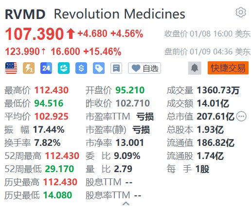 | RVMD Revolution Medicines | | 03 | | --- | --- | --- | | 107.390 ↑ +4.680 +4.56% 收盘价 01/08 16:00 美东 | | | | 123.990 * 16.600 +15.46% | | 盘前价 01/09 04:36 美东 | | 一 7 24 4 8 8 9 同 0 | | ● 快捷交易 | | 最高价 112.430 | 开盘价 95.210 | 成交量 1360.73万 | | 最低价 94.516 | 昨收价 102.710 | 成交额 14.01亿 | | 平均价 102.925 | 市盈率TM 亏损 | 总市值 207.61亿(--) | | 振 幅 17.44% | 市密率(静) 亏损 | 总股本 1.93亿 | | 换手率 7.82% | 市净率 13.001 | 流通值 186.82亿 | | 52周最高 112.430 委 比 9.09% | | 流通股 1.74亿 | | 52周最低 29.170 | 量 比 2.79 | 每 手 1股 | | 历史最高 112.430 | 股息TTM -- | ...