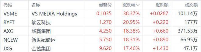 中概股收盘涨幅居前的个股为:VS MEDlA Holdings涨38.37%,软云科技涨20.95%,华赢集团涨 18.38%,新世纪储运涨18.31%,金铉集团涨17.46%。(格隆汇) | 代码 | 名称 | 最新价 | 涨跌幅√ | 涨跌额 | 成交额 | | --- | --- | --- | --- | --- | --- | | VSME | VS MEDIA Holdings | 0.1035 | 38.37% | +0.0287 | 101.14万 | | RYET | 软云科技 | 1.270 | 20.95% | +0.220 | 177万 | | AXG | 华赢集团 | 4.250 | 18.38% | +0.660 | 371.53万 | | NCEW | 新世纪储运 | 5.750 | 18.31% | +0.890 | 66.95万 | | JXG | 金铉集团 | 9.620 | 17.46% | +1.430 | 47.1万 | ...