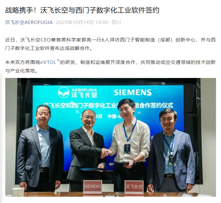 每经AI快讯,近日,沃飞长空与西门子数字化工业软件宣布达成战略合作。未来双方将围绕eVTOL的 研发、制造和运维展开深度合作,共同推动低空交通领域的技术创新与产业化落地。 ...