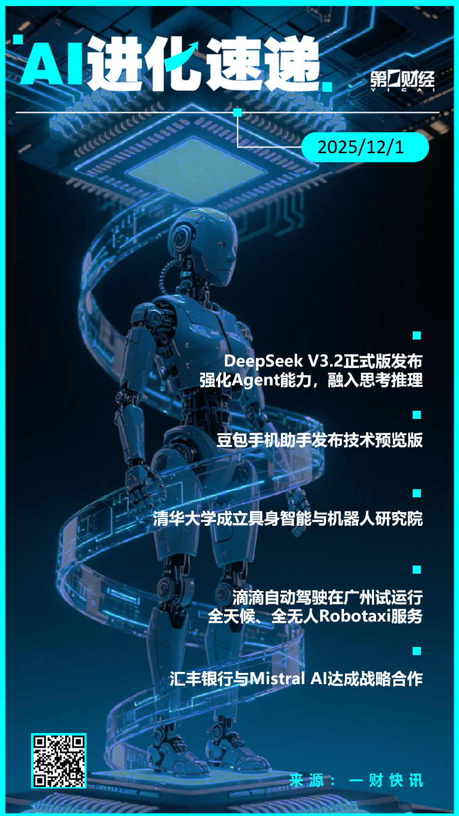 ①DeepSeek V3.2正式版发布:强化Agent能力,融入思考推理; DeepSeek V3.2正式版发布;豆包手机助手发布技术预览版。 ■ 汇丰银行与Mistral Al达成战略合作 日本报 li l = ray 滴滴自动驾驶在广州试运行 全天候、全无人Robotaxi服务 ②豆包手机助手发布技术预览版; ③清华大学成立具身智能与机器人研究院; ④滴滴自动驾驶在广州试运行全天候、全无人Robotaxi服务; ⑤汇丰银行与Mistral AI达成战略合作,以增进银行业务中生成式AI的应用。 ■ 来源:一财快讯 ...