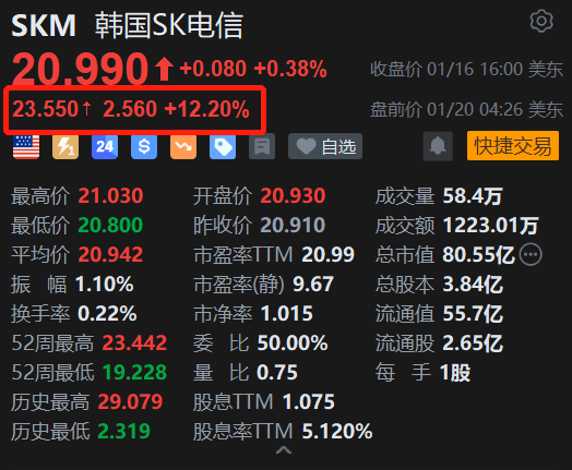 美股异动丨韩国最大电信运营商SK电讯盘前涨12.2% 推出新一代车载人工智能体