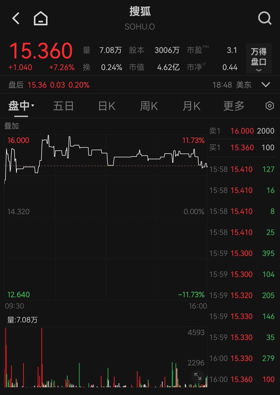 三季度业绩超预期 搜狐股价盘中一度飙涨超11%