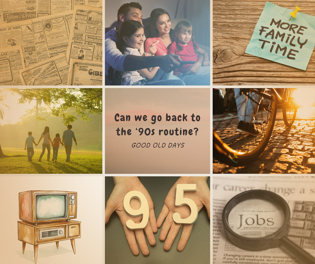 Can We Go Back to the '90s Routine?A nostalgic reflection on a simpler time, when life had rhythm, work had balance, and happiness wasn’t online.Kanchan Negi3 min read·Just nowJust now--Press enter or click to view image in full sizeCreated by me (On Canva)Can We Go Back to the ’90s Routine?9 to 6.Morning newspapers.Crisp office shirts.Evening tea.Real family time, not the kind with phones on the table.Sometimes I find myself asking, Can we ever go back?I remember my childhood, perhaps how most of us millen ...
