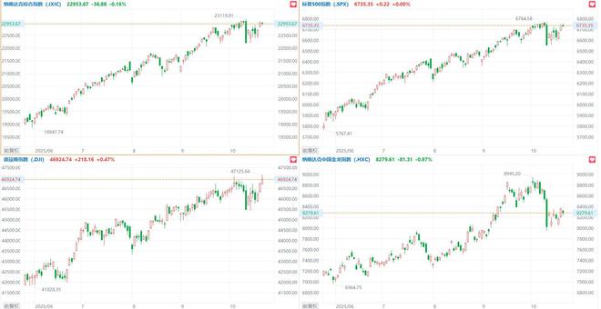 *蓝筹财报提振市场情绪 *奈飞盈利低于预期,盘后重挫 第三季度财报季进入高峰期,多家蓝筹企业业绩超出预期。 通用汽车股价飙升14.9%,公司上调全年财测并缓解关税冲击担忧。可口可乐上涨4.1%,得益于稳健的 消费需求与利润率改善;3M上涨7.7%,受高利润产品结构与成本控制支撑。 航空航天与防务板块表现强劲。洛克希德·马丁(Lockheed Martin)、诺斯洛普·格拉曼(Northrop Grumman)及RTX均上调业绩预期,带动标普1500航空航天与国防指数上涨1.9%。 "企业盈利普遍超出预期,利润率略有提升,这表明部分关税成本已被转嫁。"资产管理公司Simplify Asset Management首席策略师迈克尔·格林(Michael Green)表示,"不过市场整体仍偏谨慎,投资者对 财报惊喜的反应不如以往强烈。" *国际金银价格大幅回落 美国股市周二收盘涨跌不一,道琼斯工业平均指数创历史新高,受蓝筹股财报提振。标普500指数收盘 基本持平,而科技与半导体板块走软,令纳斯达克指数小幅下滑。 截至收盘,道指上涨218.16点,涨幅0.47%,报46924.74点;标普500指数微升0.22点,报 ...