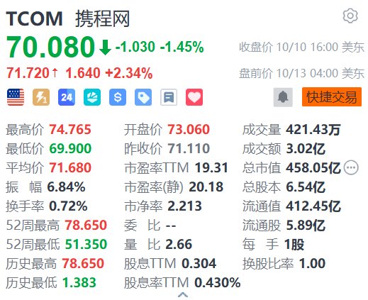 携程网(TCOM.US)盘前涨2.34%,报71.72美元。消息面上,携程宣布,与现场娱乐公司Live Nation Asia 宣布建立多年的战略合作伙伴关系,将旅游和现场音乐体验整合到亚洲的关键市场。(格隆汇) | TCOM 携程网 | | | | --- | --- | --- | | 70.080 + -1.030 -1.45% | | 收盘价 10/10 16:00 美东 | | 71.720 ↑ 1.640 +2.34% | | 盘前价 10/13 04:00 美东 | | 雪 5 24 4 5 8 9 日 0 | | ● 快捷交易 | | 最高价 74.765 | 开盘价 73.060 | 成交量 421.43万 | | 最低价 69.900 | 昨收价 71.110 | 成交额 3.02亿 | | 平均价 71.680 | 市盈率 19.31 | 总市值 458.05亿 (1) | | 振 幅 6.84% | 市盈率(静) 20.18 | 总股本 6.54亿 | | 换手率 0.72% | 市净率 2.213 | 流通值 412.45亿 | | 52周最高 78.650 | 委 比 -- | 流 ...