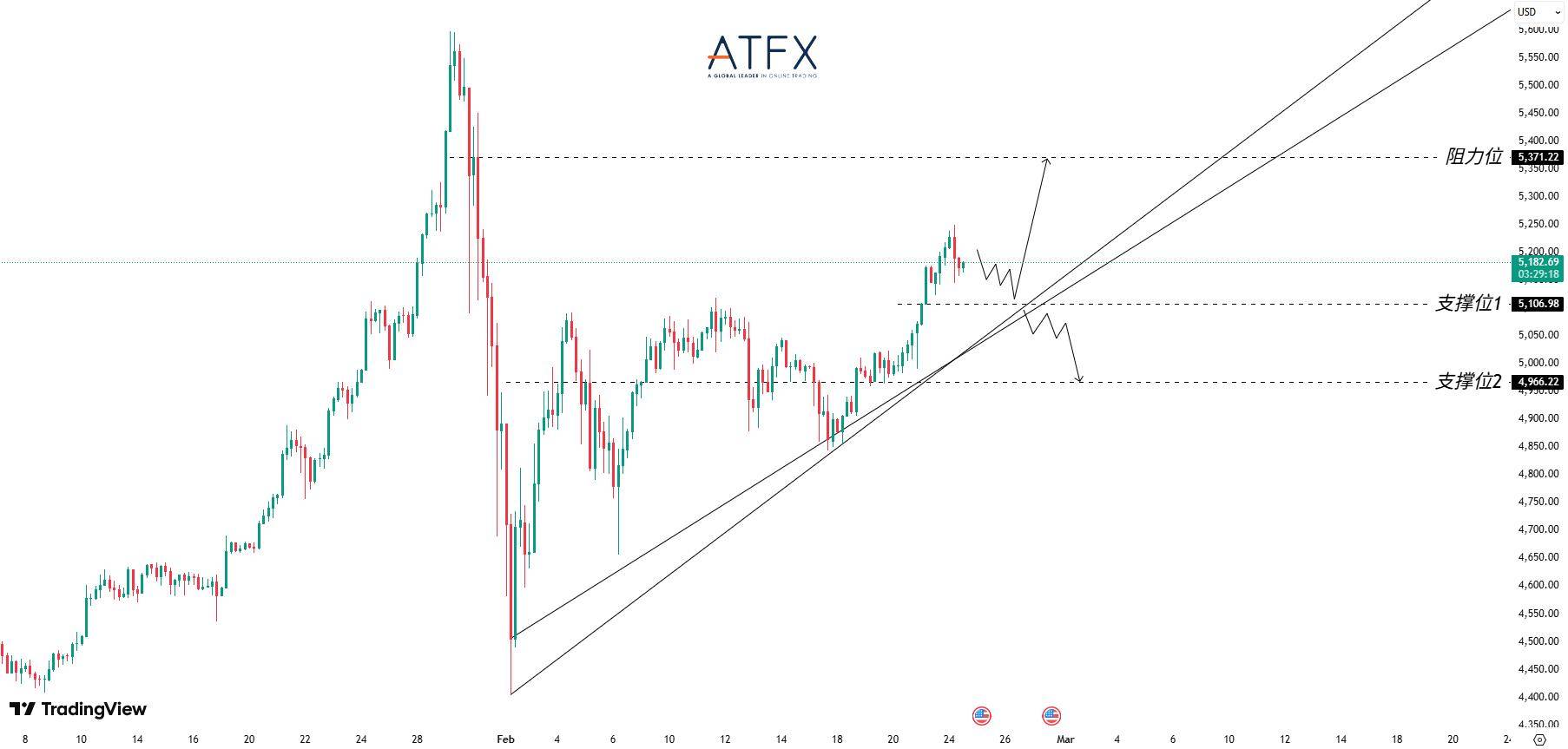 黄金市场基本面分析 - 国际金价近期延续上涨,连续多个交易日收高,当前交投于5180美元上方[1] - 全球风险环境重新升温,特朗普提出可能通过“122条款”实施最高15%的临时全球关税,贸易政策不确定性增加[1] - 中东局势持续紧张,美伊关系存在反复风险,俄乌冲突未完全缓和,地缘与贸易双重不确定性推动避险需求回流黄金市场[1] - 美国核心通胀仍具韧性,经济增长边际放缓,实际利率缺乏持续上行动能,美联储维持谨慎立场[1] - 在真实收益率未明显上升的背景下,黄金获得结构性支撑,本轮上涨更像是风险溢价扩张,而非单一政策预期推动[1] 黄金市场技术结构分析 - 4小时图显示金价自2月初低点以来沿一条清晰的上升趋势线运行,价格多次回踩趋势线获得支撑,低点持续抬高,形成稳定上行结构[3] - 金价在4950–5000区域企稳反弹后,突破5106美元这一前期整理平台,使短线结构由震荡转为延续[3] - 当前价格维持在5106美元上方震荡运行,趋势线结构尚未受到破坏[3] - 上方关键阻力位位于5371美元附近,该区域对应前期高点与明显水平压力,是多头需要面对的重要技术关口[3] - 若价格在5180–5250区域完成整理后持续走高,并对5371美元发起有效突破,则趋势有望进入新一轮扩张阶段[3] - 若价格跌破5106美元,短线动能将减弱,市场可能回测4966美元一线,该位置是前期整理中枢并接近趋势线支撑区域[3] - 只有当价格有效跌破趋势线并失守4966美元,整体结构才会从趋势延续转向阶段性修正[3] - 黄金当前仍维持在上升趋势线结构之中,基本面风险溢价与技术趋势相互强化,只要趋势线未被破坏,多头框架保持有效[3] - 随着价格逼近5371美元关键阻力区,波动或将加大,方向选择取决于阻力区的突破或趋势线的防守[3]