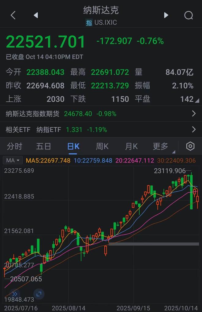 周二美股三大股指收盘涨跌不一,道指涨0.44%,纳指跌0.76%,标普跌0.16%。英伟达跌超4%,亚马 逊跌超1%,博通跌超3%,特斯拉跌超1%,甲骨文跌超2%,沃尔玛涨超4%。 纳斯达克 ( 1 指 US.IXIC 22521.701 -172.907 -0.76% 已收盘 Oct 14 04:10PM EDT 今开 22388.043 最高 22691.072 量 84.07亿 昨收 22694.608 最低 22213.729 振幅 2.10% 上涨 2030 下跌 142 / 纳斯达克指数期货 24678.40 -0.98% 相关ETF 纳指ETF 1.331 -1.19% 分时 五日 日K 周K 月K 更多 MA - MA5:22697.748 10:22759.848 20:22647.112 30:22409.306 23275.689 23119.906 22418.885 21562.081 20507.065 日 19848.473 2025/07/16 2025/09/15 2025/10/14 2025/08/14 来源:滚动播报 ...