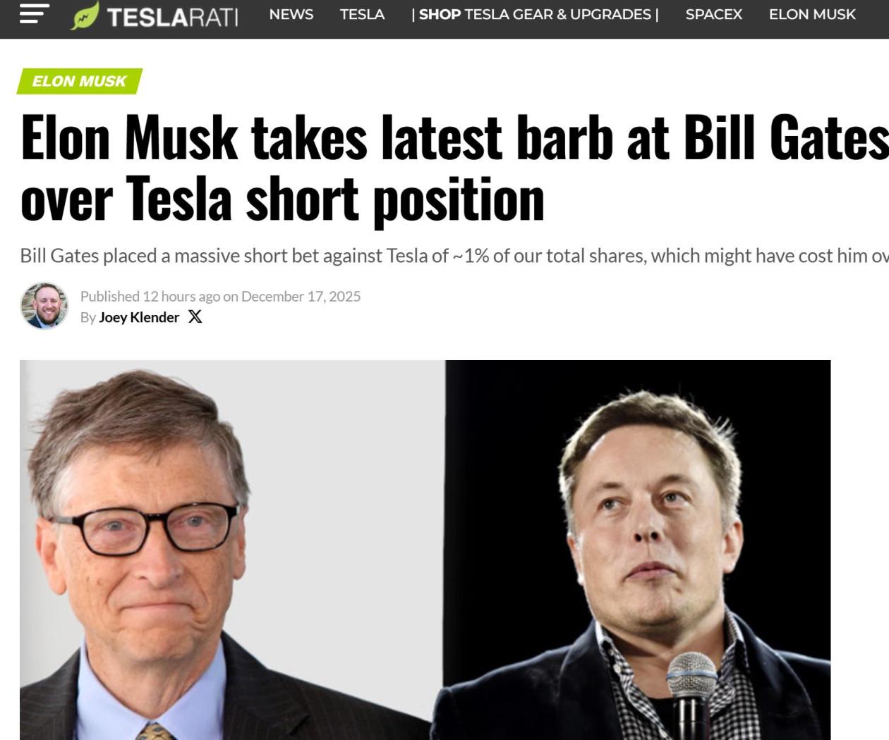 【环球网科技综合报道】12月18日消息,据teslarati报道称,特斯拉首席执行官埃隆·马斯克近日再次公开批评微软联合创始人比尔·盖茨,重提后者曾做空特 斯拉股票一事,并估算若其至今未平仓,盖茨可能已面临超过100亿美元的账面亏损。 据马斯克披露,几年前盖茨曾在短信中向他承认,自己仍持有相当于特斯拉约1%股份的空头仓位。讽刺的是,盖茨当时联系马斯克的初衷是探讨慈善合作 的可能性。对此,马斯克表示无法认真对待这一提议,理由是盖茨"希望从唯一一家认真推动电动汽车发展的公司倒闭中获利"。 外媒称,马斯克与盖茨之间的紧张关系由来已久。近年来,两人在公共政策、科技发展方向及慈善理念等多个领域存在分歧。最近一次交锋发生在11月中 旬,当时马斯克就盖茨基金会抛售其所持65%微软股份一事作出回应。(青云) ...